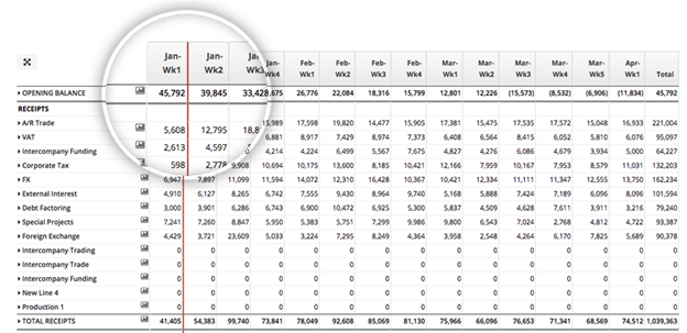 An example of a mixed-period cash forecast is shown below. This example covers a period of four months where cash flows are captured weekly in the first two months and monthly thereafter.