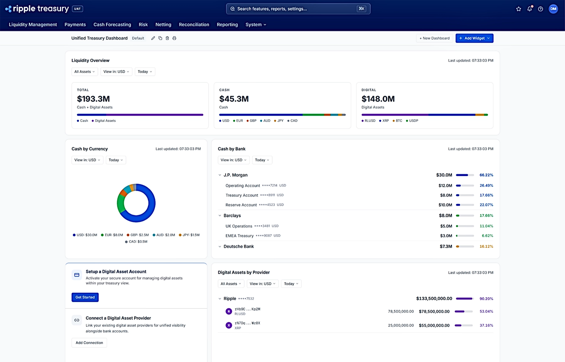 Unified Treasury changes that. Ripple Treasury brings digital asset positions, digital asset account balances and traditional cash into a single dashboard, giving you a real-time, holistic view of everything you hold, in every currency and every form.