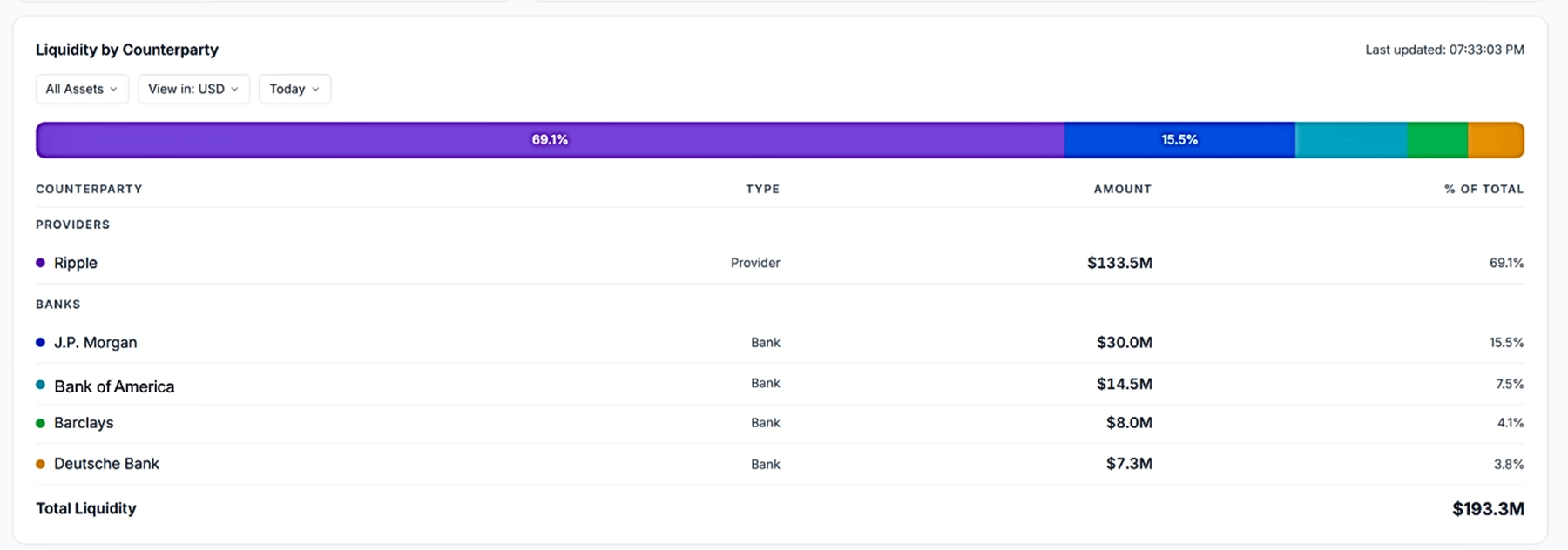 Liquidity concentration risk doesn't stop at banks. Unified Treasury lets you see your overall liquidity by counterparty, including both banking relationships and digital asset custodians, in a single view. Teams managing counterparty limits have the visibility they need to stay within policy.